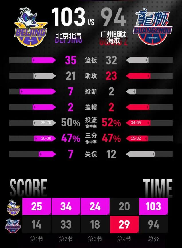 第四节开始后广州发起反击,张文杰、刘颜诚连续得分,刘颜诚单节三次命中三分,一度把分差缩小到10分。北京依靠翟晓川三分和陈盈骏的连续得分稳守优势,陈盈骏在最后关头接连中远投和罚球得分。广州全力追分,最后一分钟威金顿得分后张文杰命中三分把分差缩小到6分,北京稳扎稳罚,陈盈骏、周琦先后四罚全中守住优势,最终北京北汽客场103-94击败广州朗肽海本。