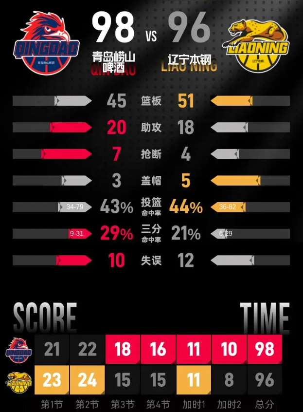 第二次加时中,双方每一次得分都被对手迅速回应,比分始终保持1分差距。段昂君接到助攻命中三分,莱迪随即抛投扳平比分,终场前9秒,王睿泽接米奇助攻绝杀跳投得分,帮助青岛拿到两分领先,辽宁最终未能完成有效进攻,青岛收下这场胜利。