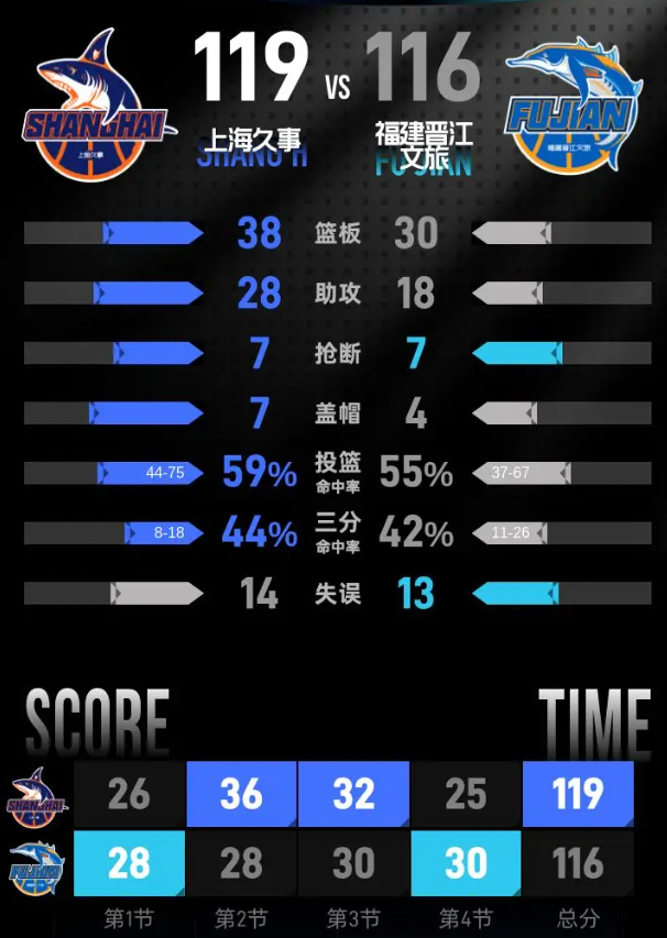 比赛进入末节,上海开局连得7分,李弘权外线三分命中后,分差扩大到15分。邹阳率先取分开启福建反扑,皮特森找回进攻手感,连续命中三分,杨曦皓也命中远投,福建打出一波15-4的进攻高潮,成功将比分反超。随后双方你来我往,分差始终保持在3分以内。最后25秒,李添荣接到助攻命中三分,帮助上海拿到4分优势。皮特森迅速造三分犯规三罚全中,将分差缩小到1分。最后2秒王哲林站上罚球线,两罚全中,上海久事以119-116击败福建晋江文旅。