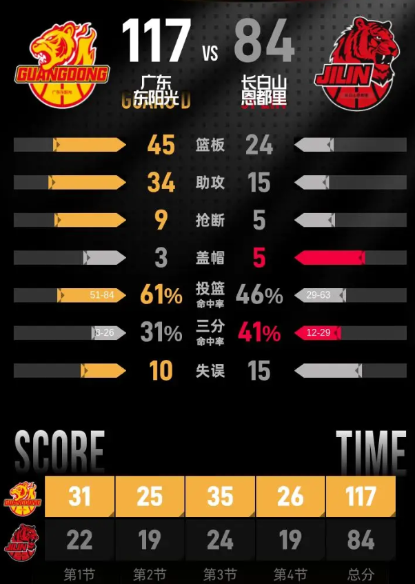 时间:2026-04-10 22:46:25北京时间4月10日CBA常规赛第37轮,主场作战的广东东阳光以117-84击败长白山恩都里。特雷维林·奎因29分7篮板7助攻,达拉斯·摩尔31分3篮板4助攻。