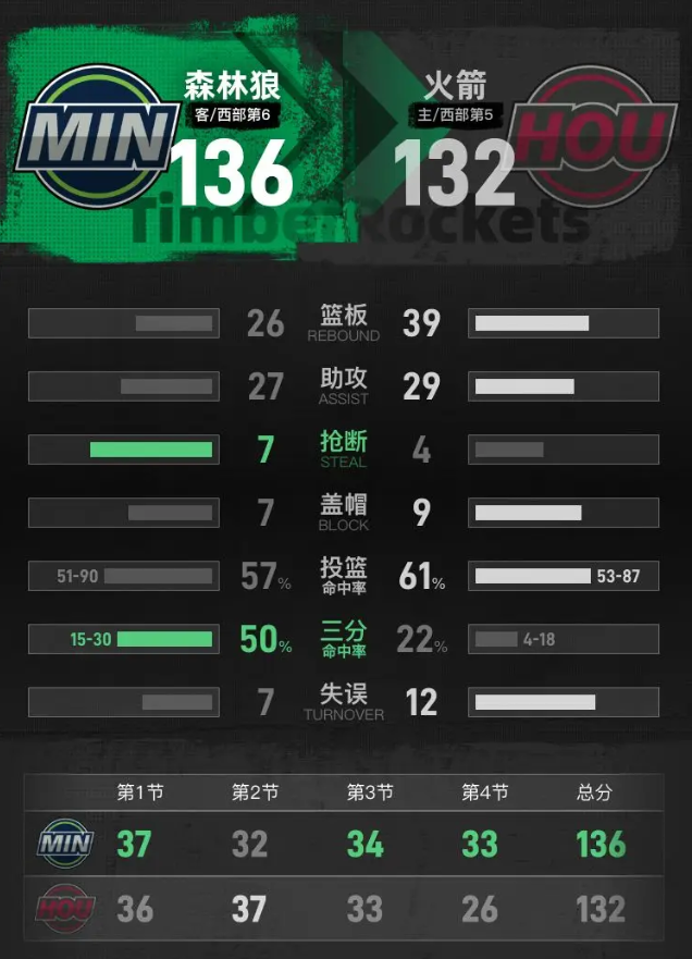进入第四节,迪文琴佐连得5分,其中一记三分扳平比分。康利再中三分,香农接连取分,森林狼打出一波13-2的攻击波,将分差拉开到9分。杜兰特、史密斯连续得分帮火箭缩小分差,森林狼依靠稳定的进攻始终保持领先。终场前50秒,爱德华兹命中三分,森林狼135-128领先7分。汤普森两罚全中,安德森罚球命中扩大优势,终场前2秒汤普森跳投命中,森林狼最终136-132客场击败火箭。