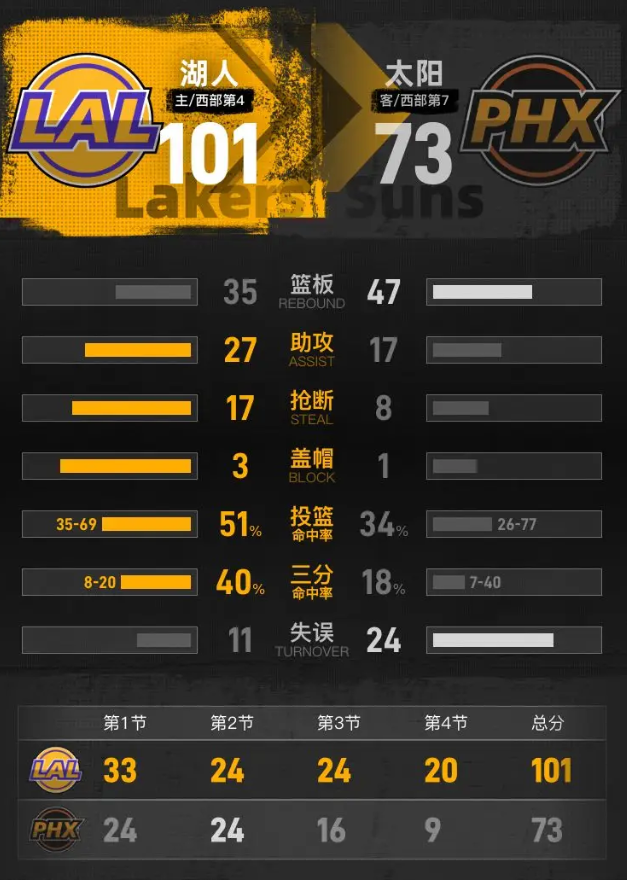 第四节开始后,湖人早早拉开分差,范德比尔特扣篮,克勒贝尔空切得分,詹姆斯罚球命中后,湖人领先优势突破20分。太阳几次追赶都没能把分差缩小到20分以内,湖人替补延续进攻状态,布朗尼、克内克特接连命中远投,分差一度拉开到29分。最后时刻太阳马卢阿奇扣篮得分,马尼翁罚中一球,最终湖人主场101-73击败太阳。