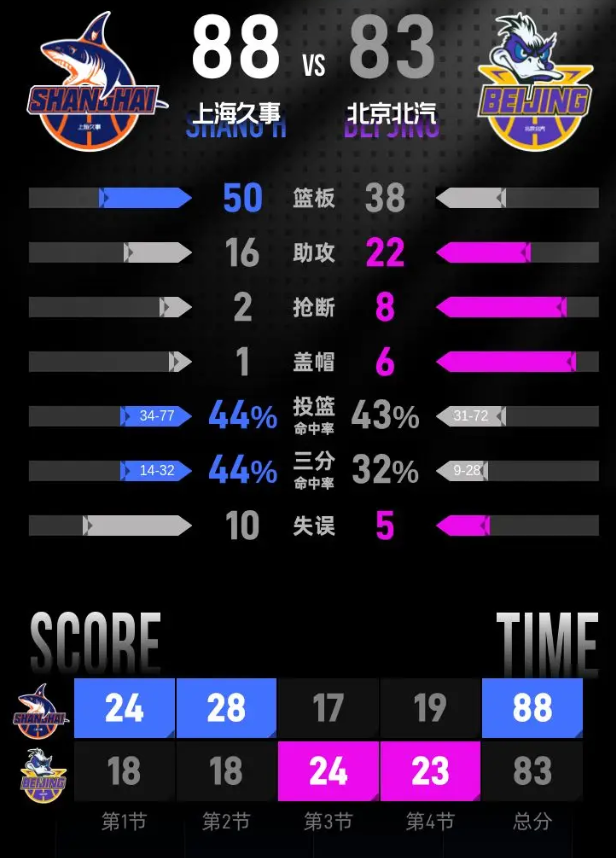 时间:2026-04-12 22:28:28北京时间4月12日CBA常规赛第38轮,客场作战的上海久事以88-83击败北京北汽,上海久事取得19连胜。王哲林24分17篮板3助攻,陈盈骏16分1篮板9助攻。