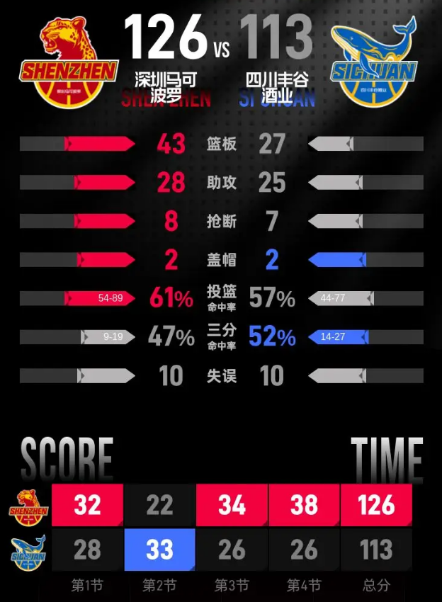 比赛进入末节,深圳迅速拉开分差,史密斯、卢鹏羽先后命中三分,王浩然连续取分,打出一波17-2的得分高潮,分差很快来到17分。落后的四川队维纳莱斯连续命中三分追分,深圳始终保持两位数领先优势。比赛收官阶段,杜智博、于枭永先后得分缩小差距,卢鹏羽完成灌篮锁定最后两分,最终深圳马可波罗客场126-113击败四川丰谷酒业。