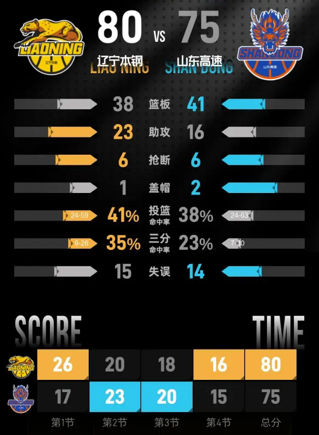 北京时间4月13日CBA常规赛第38轮,客场作战的辽宁本钢以80-75击败山东高速,山东高速遭遇3连败。赵继伟13分1篮板6助攻,德沃恩·艾库恩-珀塞尔22分3篮板5助攻。