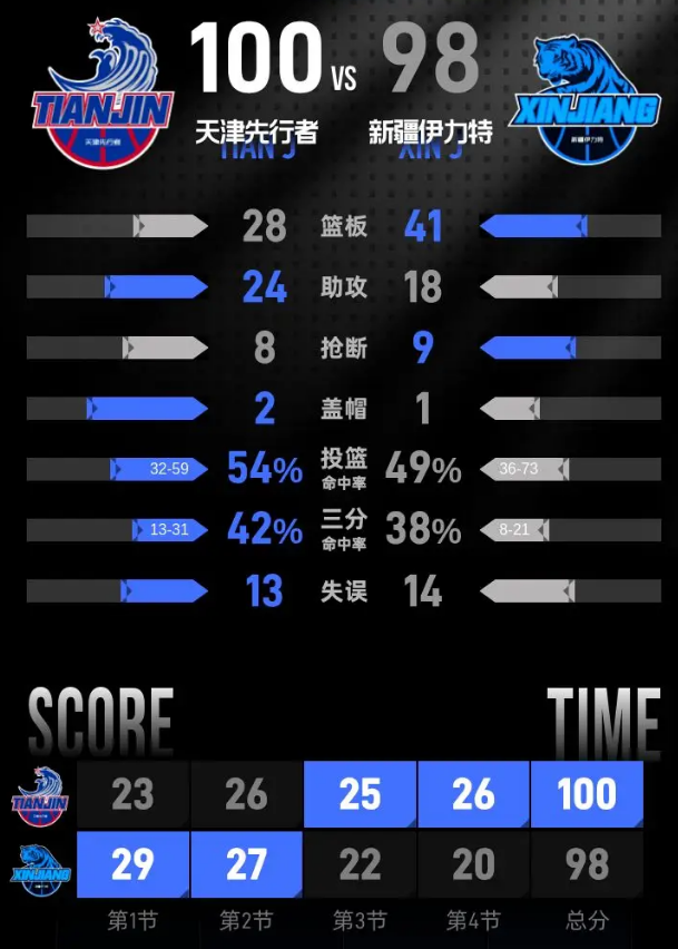 第四节开始后,新疆连得7分打出攻击波,将分差拉开到11分。天津外线找到手感,连续两记三分命中迅速缩小分差,双方你来我往,分差始终保持在个位数。比赛剩余1分29秒,田雨接助攻命中三分,天津将分差缩小到1分。艾孜麦提篮下得分,新疆重新拿到3分领先。谷泽浴上篮得分追近分差,詹姆斯两罚全中把比分扳平。最后9秒,哈姆雷特走上罚球线,两罚全中帮助天津拿到2分领先。新疆没能完成最后一攻,最终天津在主场收下胜利。