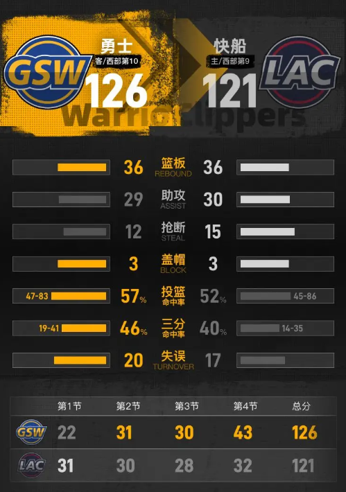 全场具体比分(快船队在后):22-31、31-30、30-28、43-32。