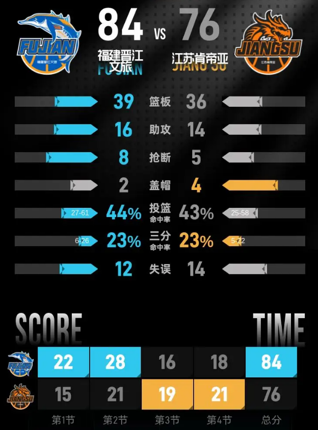 进入第四节比赛,邹阳两罚全中拉开末节大幕,刘正清接贾尔斯助攻命中三分,贾尔斯连续两次篮下得分,庞峥麟两罚全中,分差很快缩小到6分。杨曦皓接助攻命中三分稳住局势,江苏延续追分势头,贾尔斯灌篮后加罚命中,庞峥麟上篮得分将分差缩小到4分。皮特森两罚全中,吴羽佳命中三分,庞峥麟跳投命中后分差只剩1分。杨曦皓罚中一分,邹阳上篮稳住局势,最后时刻皮特森和邹阳连续四罚全中,最终福建以84-76击败江苏。