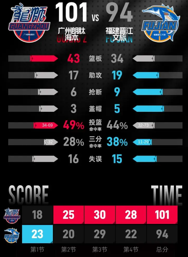 福建晋江文旅队:约安·马昆杜21分3篮板3助攻、邹阳21分2篮板、昆汀·皮特森19分2篮板3助攻、黎伊扬13分5篮板7助攻、以赛亚·布里斯科7分1篮板2助攻、杨曦皓7分5篮板、弗拉迪米尔·布罗兹安斯基4分5篮板1助攻、杨阿力2分3篮板、刘金雨3篮板3助攻、冯洺臻1篮板。