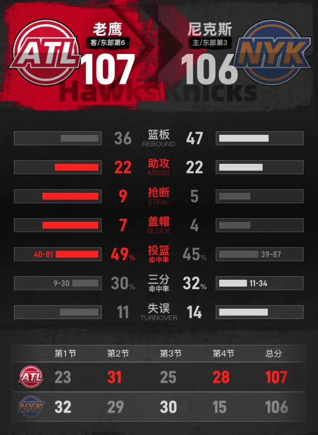 北京时间4月21日NBA季后赛,客场作战的老鹰以107-106击败尼克斯,将总比分扳成1-1平。麦科勒姆32分3篮板6助攻,哈特15分13篮板6助攻。
