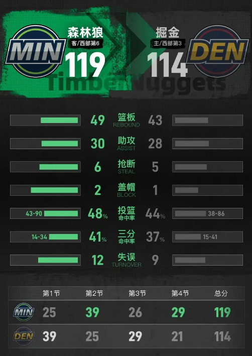 第四节开始后,布鲁斯·布朗连中两记三分,帮助掘金稳住领先优势,里德连续砍分紧咬比分,麦克丹尼尔斯上篮得分把分差缩小到1分。兰德尔连续罚球和内线得分,帮助森林狼再度反超,迪文琴佐上篮得手后把优势扩大到3分。戈登三分命中把分差追至1分,迪文琴佐接爱德华兹助攻命中三分再次拉开分差,约基奇突破上篮追到差2分,布劳恩罚球命中后把分差缩小到1分。最后18秒兰德尔两罚全中把优势扩大到3分,最后3秒迪文琴佐扣篮得手,森林狼客场119-114击败掘金。