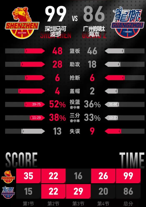 深圳马可波罗队:贺希宁29分7篮板3助攻、特奎维恩·史密斯26分13篮板13助攻、约书亚·克里斯托弗13分3篮板、李慕豪10分5篮板2助攻、王浩然10分6篮板1助攻、阿立兹·约翰逊9分13篮板7助攻、卢鹏羽2分1篮板、容子峰2助攻。