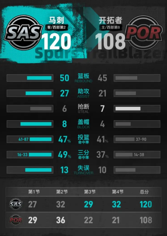 进入第四节比赛,双方开场后几度战平,比分交替上升。哈珀延续火热状态,连中两记三分后完成突破扣篮,卡斯尔连续命中三分和急停跳投,马刺打出一波12-2的攻击波,将分差拉开到两位数。马刺牢牢把握领先优势,不断扩大分差,最终阶段卡斯尔和福克斯连续得分将分差拉大到15分,亨德森最后命中三分也无力回天,最终马刺客场120-108击败开拓者。