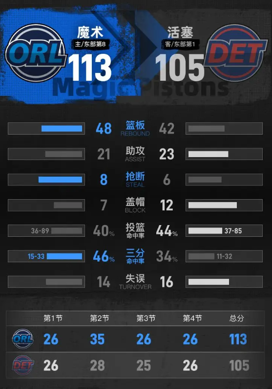 比赛进入末节,贝恩开场连得5分,卡特两次补篮得分,魔术打出7-0的小高潮将领先优势扩大到17分。活塞延续进攻手感,哈里斯接连命中三分,坎宁安连续突破造杀伤,两人联手打出16-4的进攻波,坎宁安命中三分后将比分追至104平。瓦格纳跳投得分重新帮魔术取得领先,随后瓦格纳接到班凯罗助攻命中三分,把分差扩大到4分。卡特罚中一球后,班凯罗在最后38秒命中三分,帮助魔术稳住局势,最终主场113-105击败活塞。