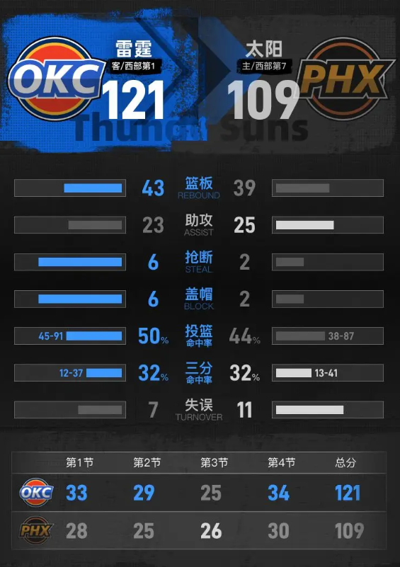 进入第四节比赛,米切尔三分命中拉开进攻序幕,奥尼尔回敬三分止血,霍姆格伦连续内线得分,亚历山大延续火热状态,连续突破上篮拉开分差,领先优势一度达到15分。布鲁克斯连续砍下八分,太阳把分差缩小到10分,多尔特和卡鲁索先后命中三分,雷霆重新稳住局势。最后两分钟,亚历山大和多尔特连续得分巩固优势,布鲁克斯接连命中三分仍无力改变战局,最终雷霆客场121-109击败太阳。