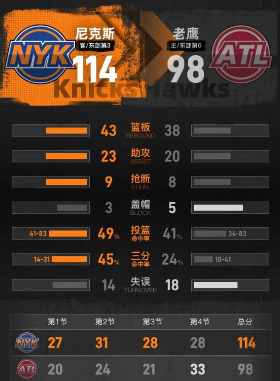 进入第四节比赛,阿奴诺比罚中一球,麦科勒姆罚中一分,阿奴诺比三分命中将分差扩大到24分。基斯珀特补篮得分,沃克三分命中把分差缩小到18分,布伦森两罚全中,麦克布莱德命中三分,库明加连拿4分,分差维持在20分上下。麦克布莱德再中三分,布伦森也命中三分,尼克斯重新将分差拉到24分。奥孔古三分命中,沙梅特回敬三分稳住优势。最后两分钟老鹰换下主力替补追分,里萨谢命中三分把分差缩小到14分,科勒克勾手命中,最终尼克斯客场114-98击败老鹰。