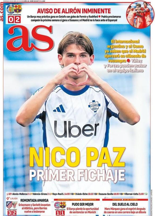 本周日的《阿斯报》将尼科-帕斯放在了封面位置,报道称皇马将执行其在科莫手中的回购条款,他将成为皇马下赛季的“第一笔签约”。