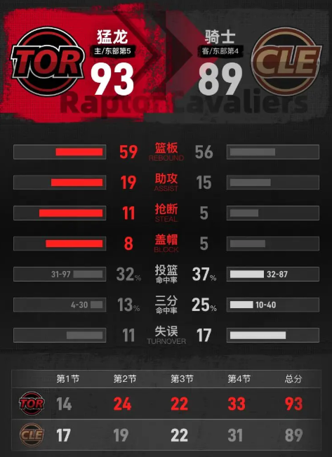 全场具体比分(猛龙队在后):17-14、19-24、22-22、31-33。