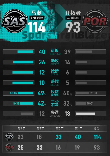 进入第四节比赛,文班亚马开局就连进三个吃饼暴扣,马刺反超比分后迅速拉开分差。福克斯连续突破得分,再命中三分,随后助攻约翰逊投进三分,马刺打出一波18比3的攻击波,分差一下子拉开到13分。开拓者霍勒迪两罚全中、格兰特上篮拿分,未能阻挡马刺的进攻势头,福克斯再进三分,约翰逊反击暴扣得手,分差突破20分。开拓者阿夫迪亚连拿5分缩小些许差距,马刺多点开花继续扩大优势,卡斯尔突破得分,文班亚马四罚全中,布莱恩特命中三分,分差重回21分。默里突破拿下两分,麦克劳林抛投命中,最终马刺以114比93拿下比赛。