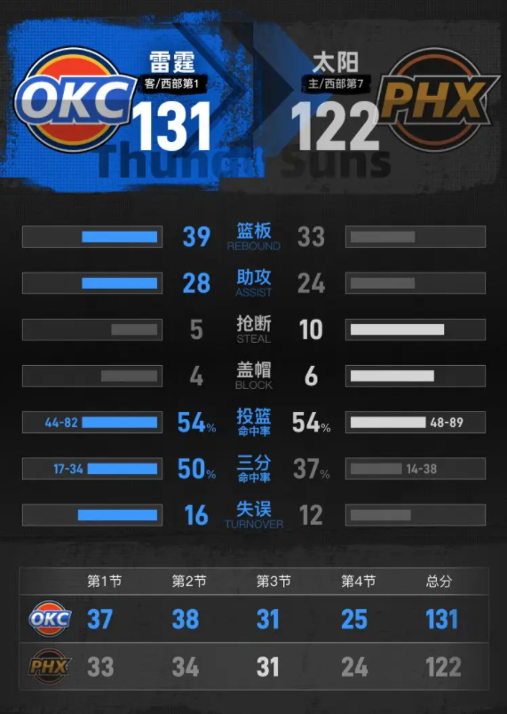 北京时间4月28日NBA季后赛,客场作战的雷霆以131-122击败太阳。霍姆格伦24分12篮板3助攻,布克24分0篮板6助攻。