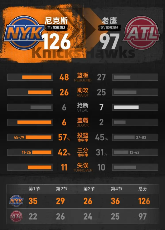 北京时间4月29日NBA季后赛,主场作战的尼克斯以126-97击败老鹰。阿奴诺比17分10篮板1助攻,约翰逊18分10篮板6助攻。